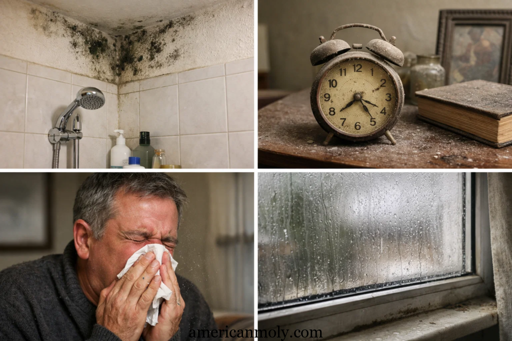 • Visible mould patches appearing on bathroom walls, window sills, or behind furniture
